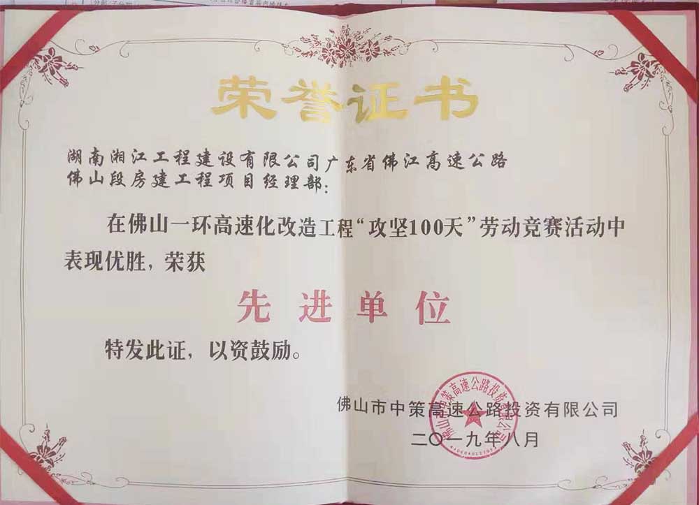 近期,由公司承建的佛山高速公路佛山段房建工程項目部在佛山一環(huán)高速化改造工程開展的“攻堅100天”勞動競賽活動中表現(xiàn)優(yōu)異,以高質(zhì)量的工作成績力超中國鐵建等三家參建企業(yè),榮獲業(yè)主單位頒發(fā)的先進單位榮譽稱號..