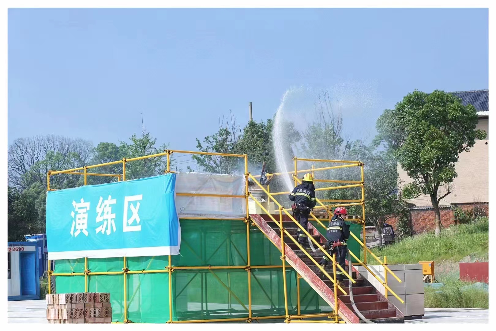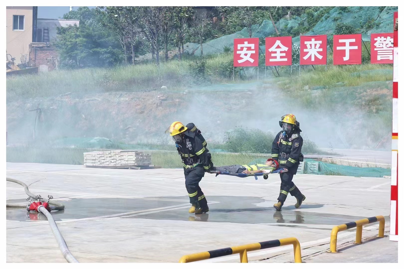 在隨后的生產(chǎn)安全事故綜合應(yīng)急救援演練中,模擬工地突發(fā)火災(zāi)導(dǎo)致人員被困的情況。項目部迅速根據(jù)應(yīng)急預(yù)案疏散工人、請求救援。消防救援大隊、醫(yī)院接到電話后迅速出動,密切配合,撲滅了火災(zāi),救出了被困人員并將傷者送往醫(yī)院救治。整個演練過程流暢,行動一致,現(xiàn)場處置合理,順利有序完成。