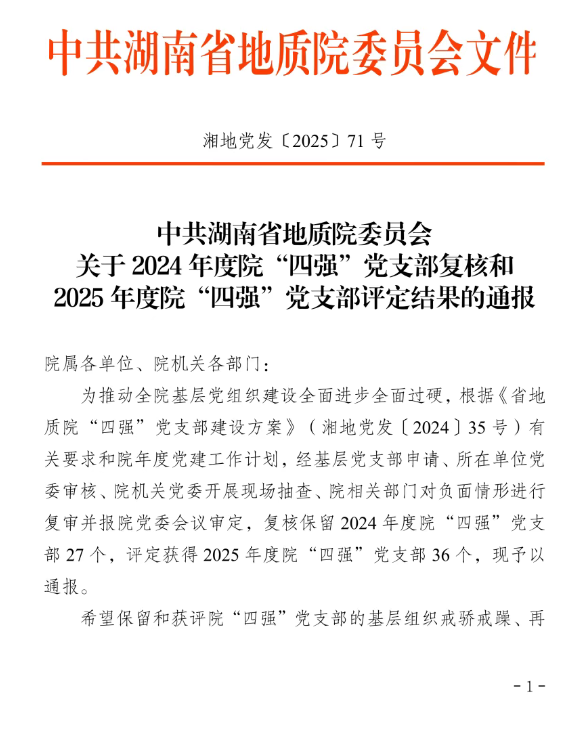 近日,中共湖南省地質(zhì)院委員會印發(fā)《關(guān)于2024年度院“四強(qiáng)”黨支部復(fù)核和2025年度院“四強(qiáng)”黨支部評定結(jié)果的通報》。湖南地質(zhì)空間所黨群綜合黨支部(省直機(jī)關(guān)“四強(qiáng)”黨支部)、包金山礦業(yè)黨支部通過復(fù)核,保留“2024年度院‘四強(qiáng)’黨支部”稱號;湘江公司新田職教基地項目黨支部、生態(tài)環(huán)境二黨支部、財務(wù)資產(chǎn)部黨支部獲評“2025年度院‘四強(qiáng)’黨支部”稱號。