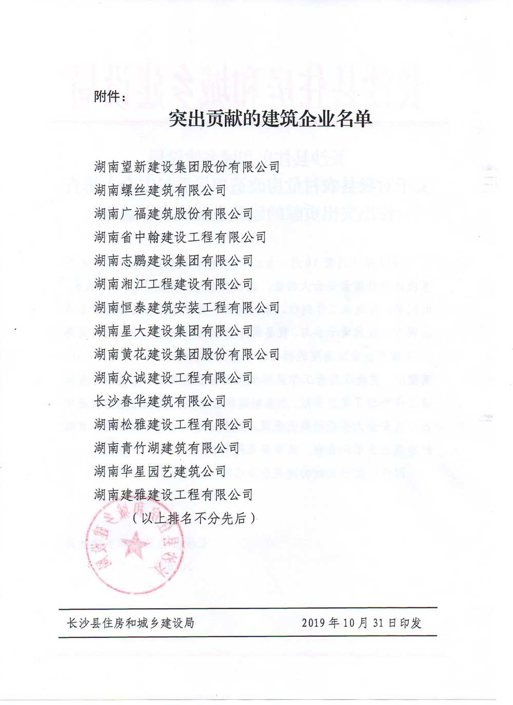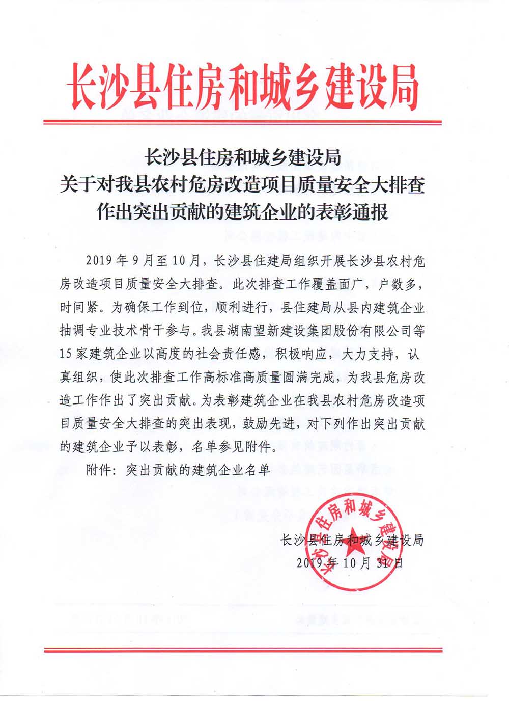 2019年10月31日,長沙縣住房和城鄉(xiāng)建設局印發(fā)《關于對我縣農(nóng)村危房改造項目質(zhì)量安全大排查作出突出貢獻的建筑企業(yè)的表彰通報》,湘江公司作為獲表彰企業(yè)位列其中。