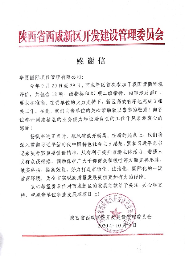 2020年10月9日,華夏國際項目管理有限公司收到了來自陜西省西咸新區(qū)開發(fā)建設管理委員會的一封感謝信。信中,西咸新區(qū)開發(fā)建設管理委員會對我公司在其參加中國營商環(huán)境評價中的大力配合,表示衷心感謝。該評價共包含18項一級指標和87項二級指標,內(nèi)容涉及面廣、要求標準高,我公司各位參評人員以精湛的業(yè)務能力和高度負責的工作態(tài)度圓滿完成此次任務,受到客戶的肯定。